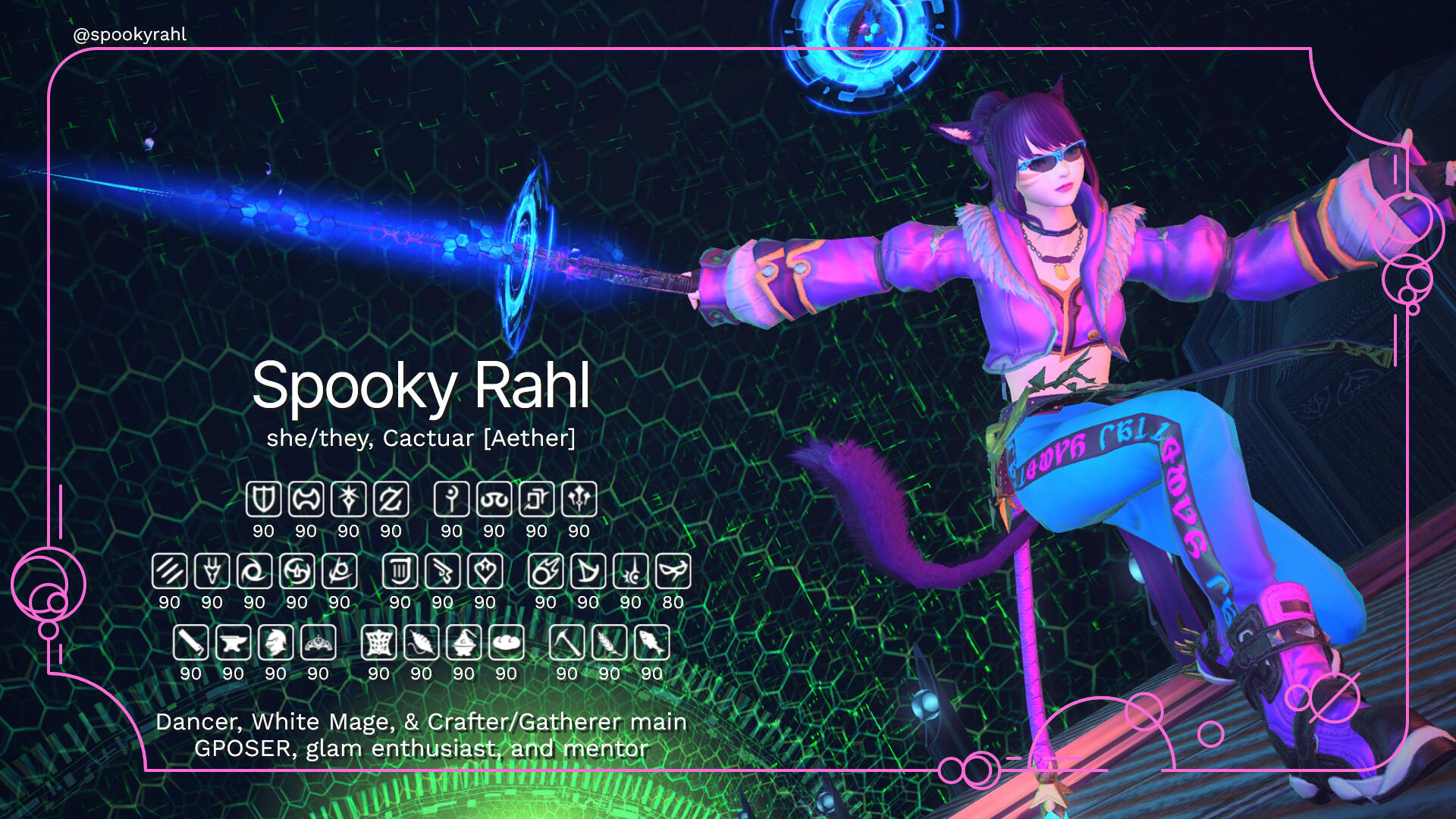 Spooky is a fashionista, Triple Triad enthusiast, PVP cryptid, rabid housing and Island Sanctuary fan and an achievement hunter! They spends a lot of their time doing Mentor roulette right now and takes being a mentor as seriously as you can in a video game. They love to help others in anyway possible and work on completing their collections!(If you see me, please feel free to say hello!)My main also has two alts associated with them! A lalafell named "Wind-up Spooky" made to be like a minion/mammet and the other is their Azem who's name is Saulė.⭒☆━━━━━━━━━━━━━━━━━━━━━━━━━━━━━━━━━☆⭒