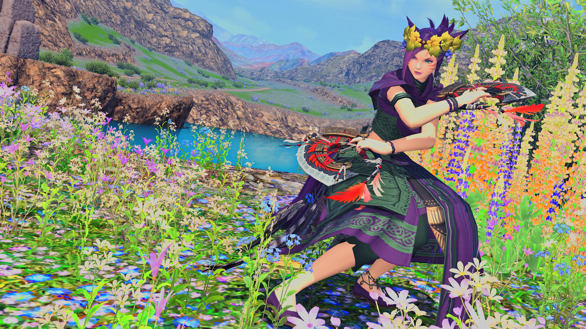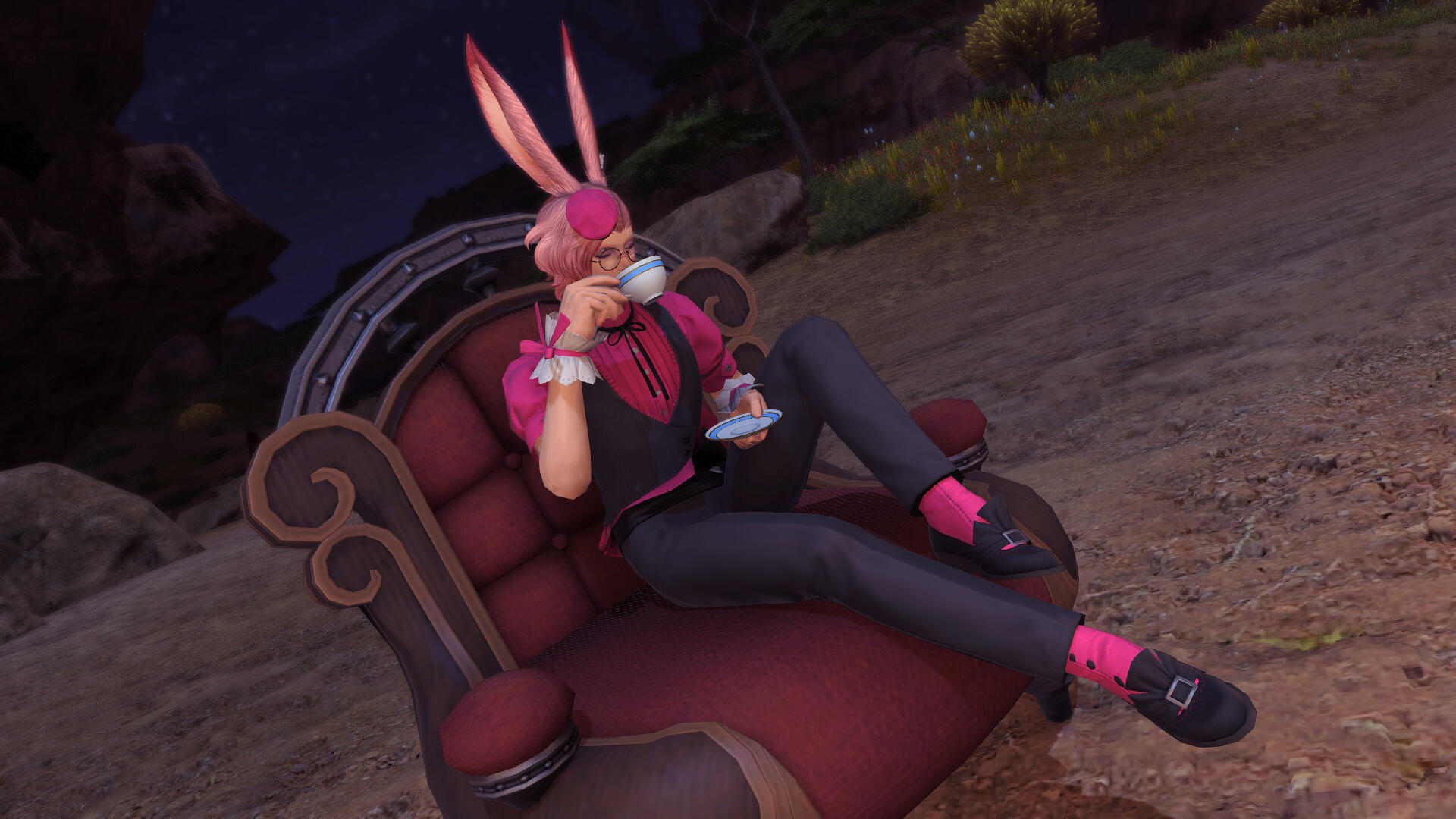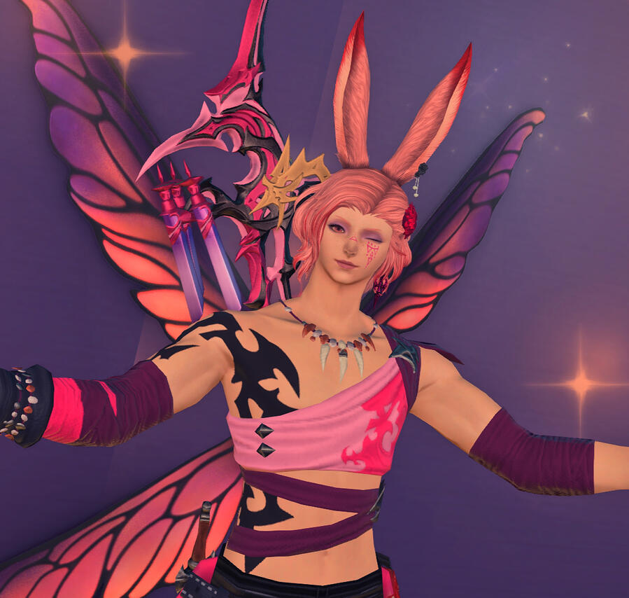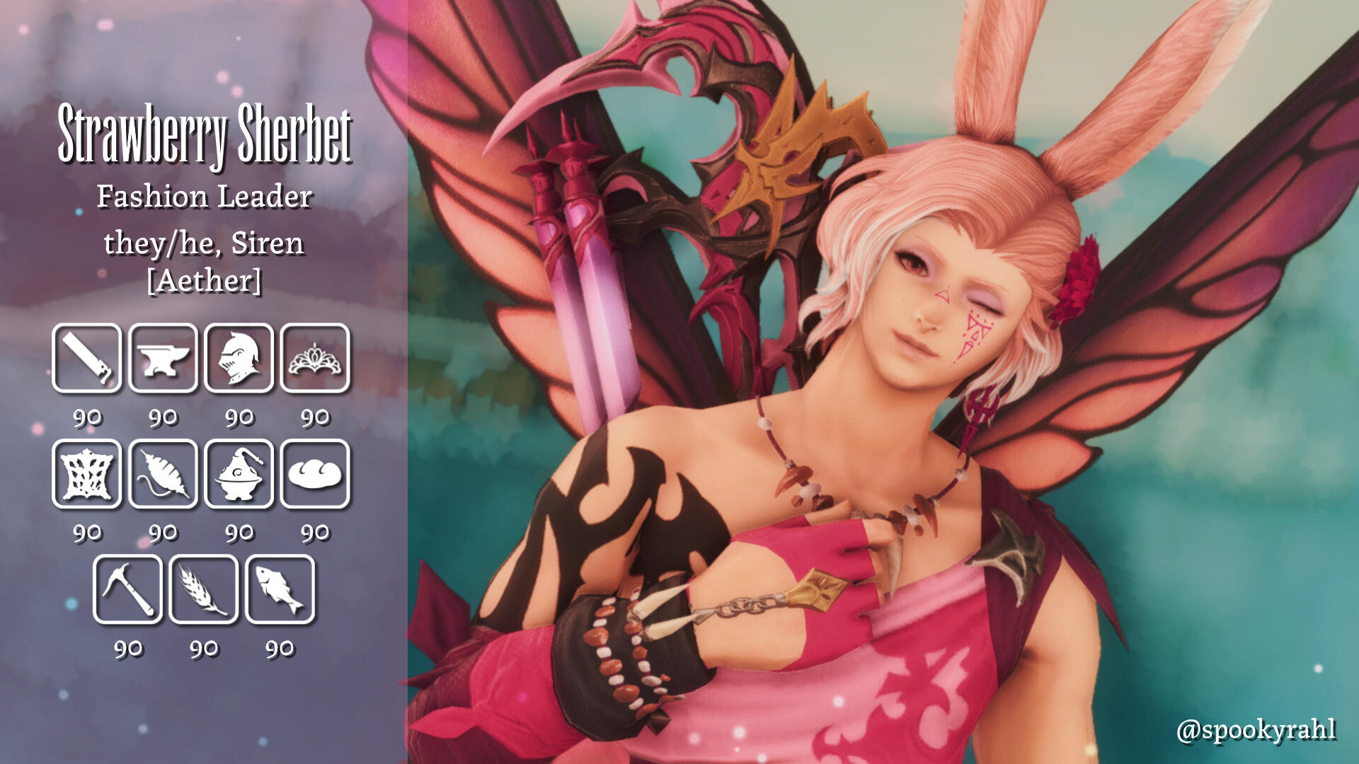 My story-focused, second playthrough character I play on Twitch! My secondary, fully leveled, omni-crafter/gatherer! Here for the story and to be cute and pink 💕