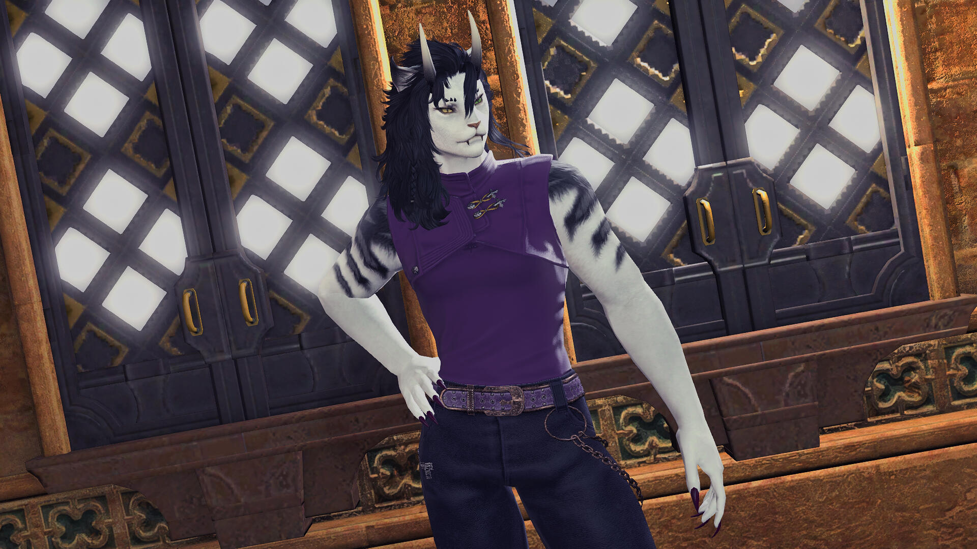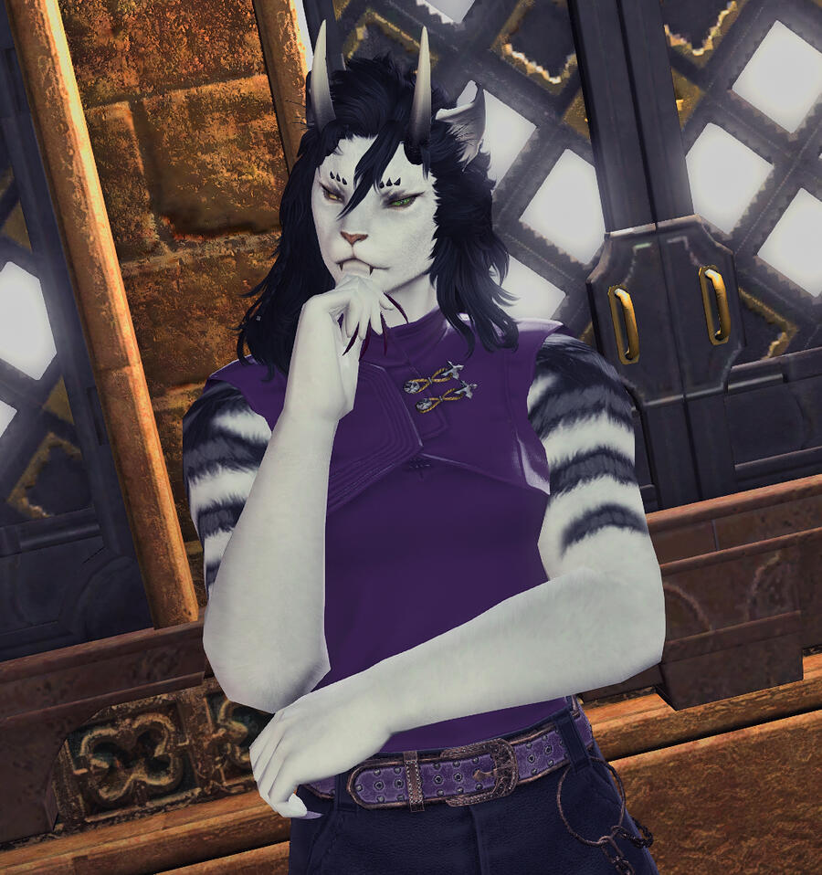 A Xbr'aal woman from Tural. She left home to hunt more exciting prey and come back more skilled. Her goal is to be able to protect her village and find a suitable partner. Her name is a "city name" to fit in better in Eorzea with their small hrothgar population so she isn't so lonely far from home.(Really her name is a stand in based on current hrothgar naming conventions until we learn more about Xbr'aal naming conventions, especially female names.)